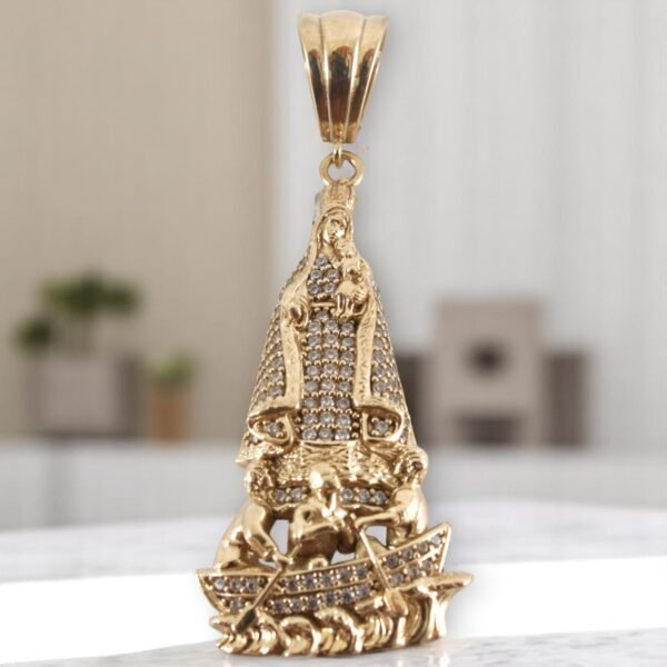 Devoción y arte en una sola pieza: el Dije Virgen de la Caridad en oro 10K con zirconias, y un peso de 7.7g, refleja fe, protección y un brillo que inspira. Ideal para llevar cerca lo más sagr